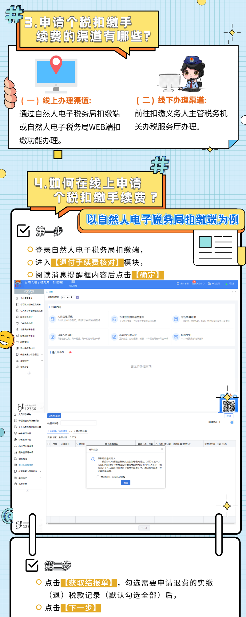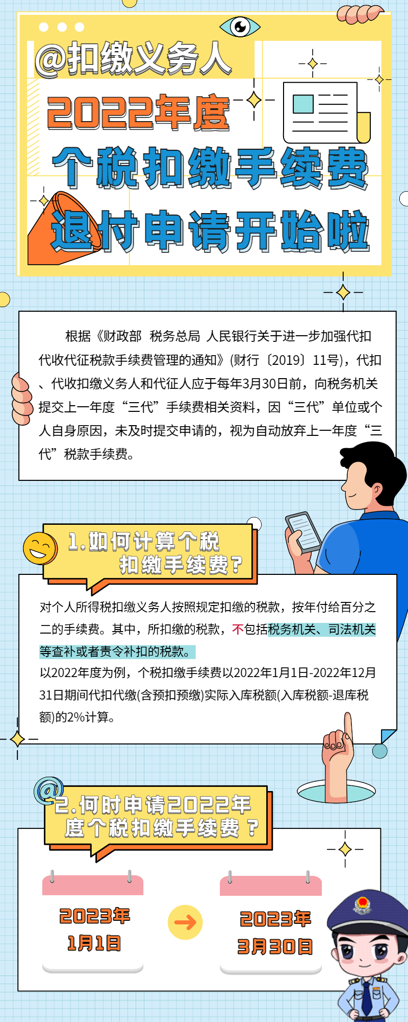 根据《中华人民共和国个人所得税法实施条例》第三十三条规定,税务机关按照个人所得税法第十七条的规定付给扣缴义务人手续费,应当填开退还书;扣缴义务人凭退还书,按照国库管理有关规定办理退库手续。根据《国家税务总局关于修订部分个人所得税申报表的公告》(国家税务总局公告2019年第46号)规定,自2020年1月1日起,扣缴义务人申请个人所得税代扣代缴手续费,填写《代扣代缴手续费申请表》。