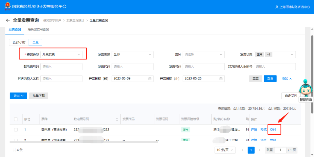 进入税务数字账户,选择发票全量查询功能,找到要下载的发票,选择交付: