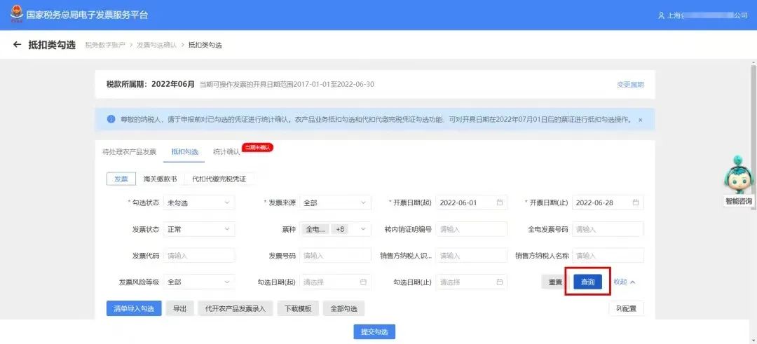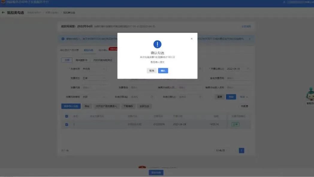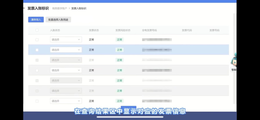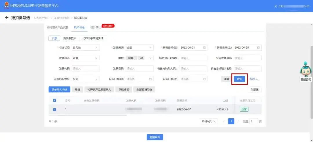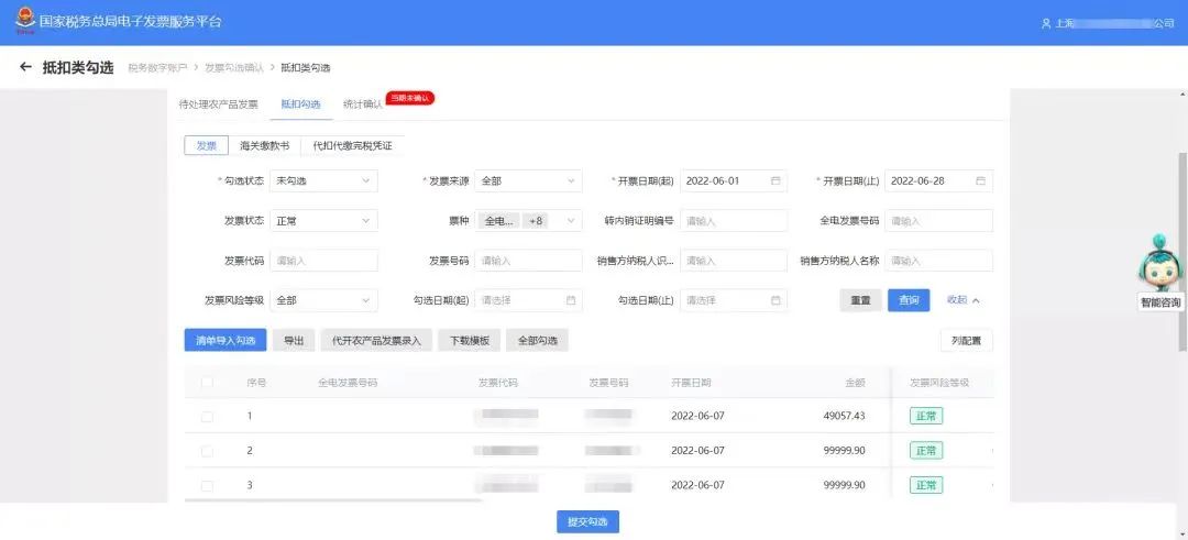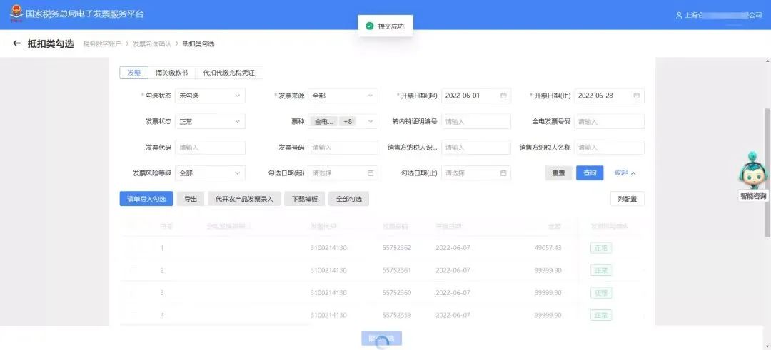(6)系统根据纳税人的查询条件,在操作区以列表形式展示符合条件的发票信息,纳税人选中本次需要勾选的发票;