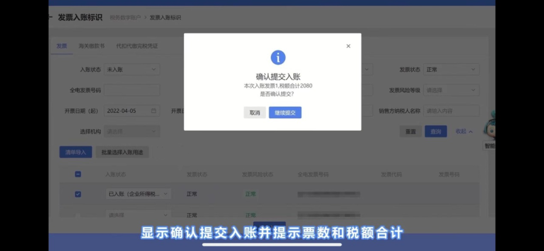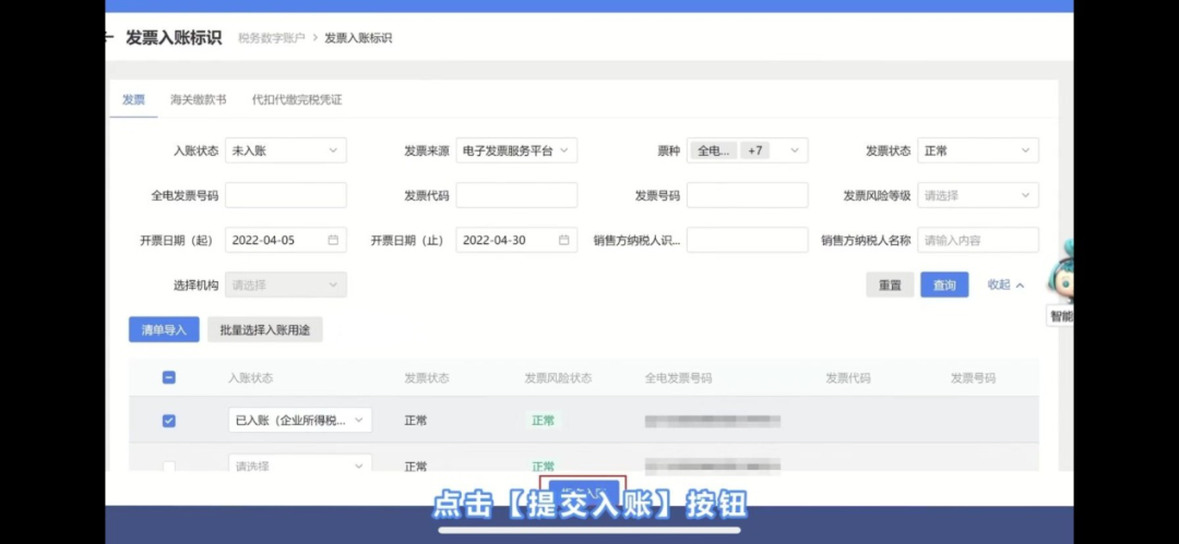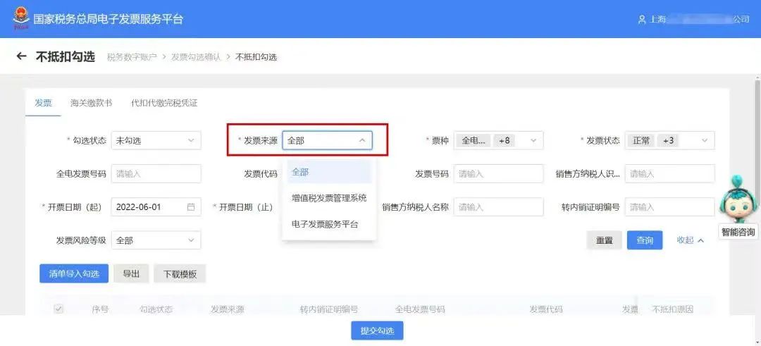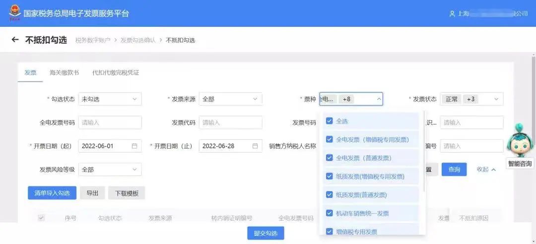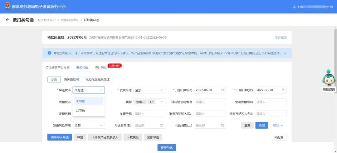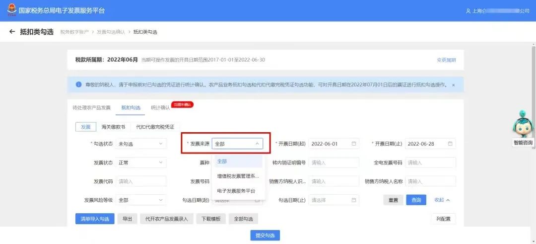 (6)系统根据纳税人的查询条件,在操作区以列表形式展示符合条件的发票信息,纳税人选中本次需要勾选的发票;