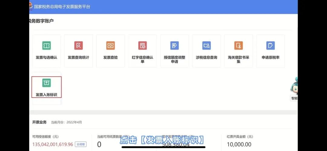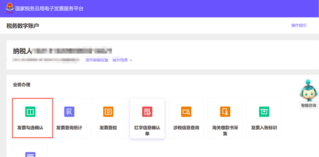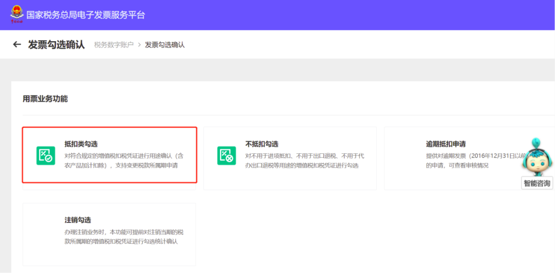 (2)点击【税务数字账户】--【发票勾选确认】--【抵扣类勾选】;