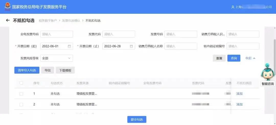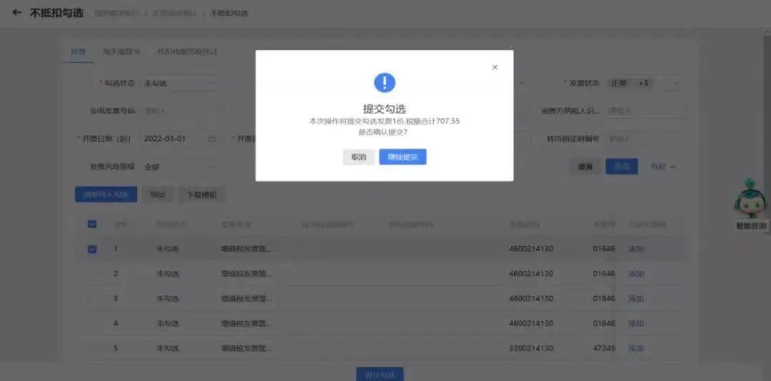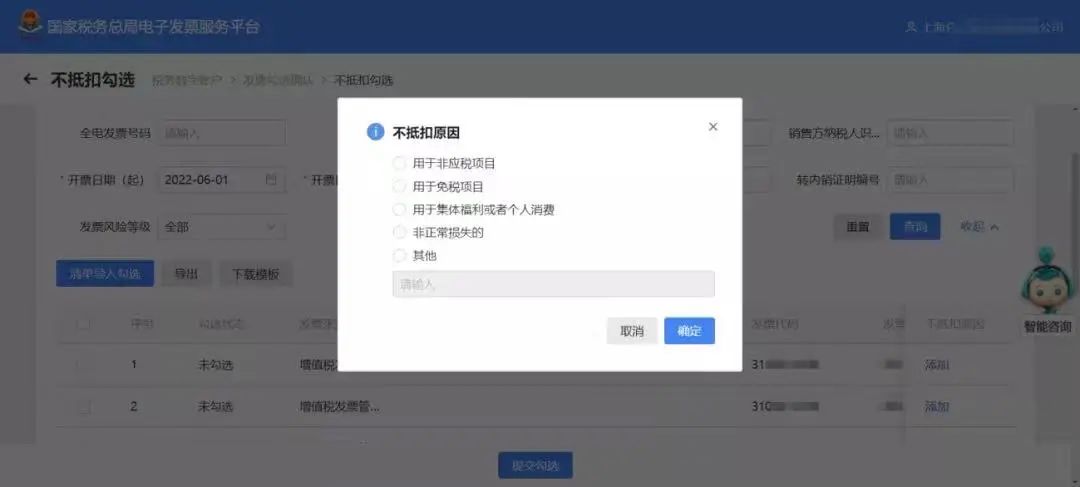 (8)根据查询结果对选择的发票进行不抵扣勾选操作,确认本次要勾选的发票勾选后,点击【提交勾选】,弹出不抵扣原因窗口,选择“不抵扣原因”,点击【确定】;