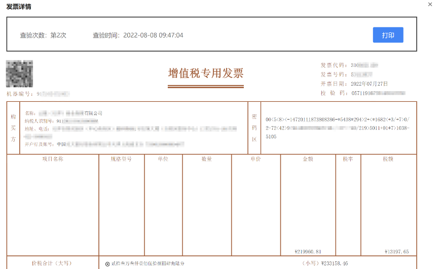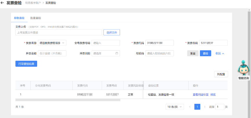 ③纳税人点击“查验”按钮,查询结果区自动显示发票信息和查验结果。