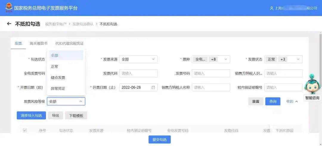 (6)选择需要查询的【发票风险等级】,不确定哪种票种时点击【全部】。发票风险等级为“疑点发票”的发票显示为黄色,纳税人在勾选该类发票时系统将进行相应的提示,请谨慎操作。风险等级为”异常凭证“的发票显示黄色,且不允许操作;