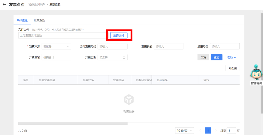 ①纳税人可选择上传发票文件进行查验。纳税人点击“选择文件”,支持PDF、OFD、XML和含有发票二维码的图片。
