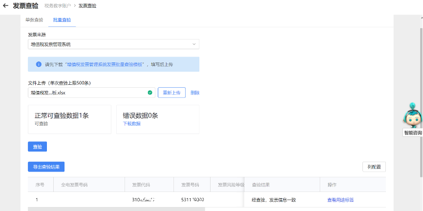 ④上传文件后点击“查验”,查询结果区自动显示发票信息和查验结果,纳税人可点击“查看用途标签”。