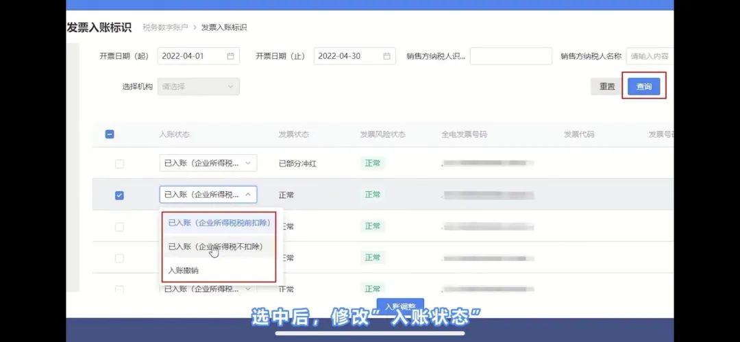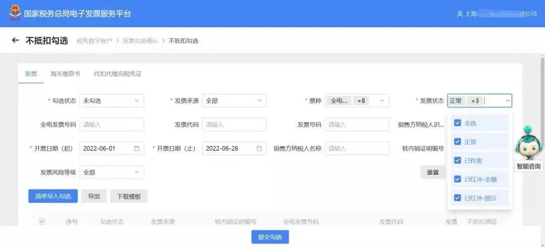 (5)选择需要查询的【发票状态】,不确定哪种票种时点击【全选】;