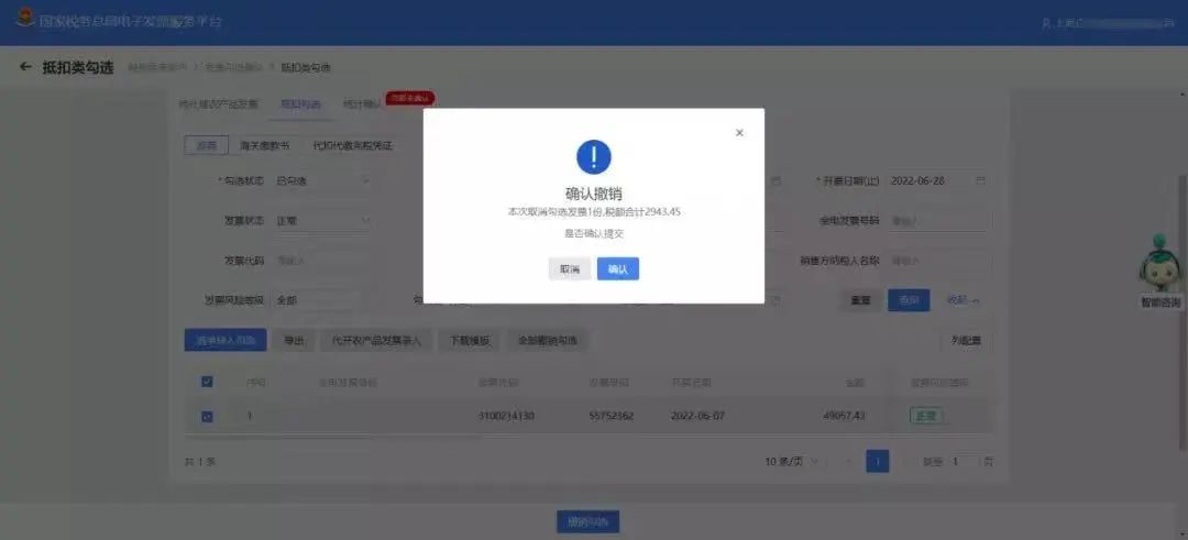 (2)点击【撤销勾选】,系统提示【本次取消勾选发票的份数,税额合计数】;