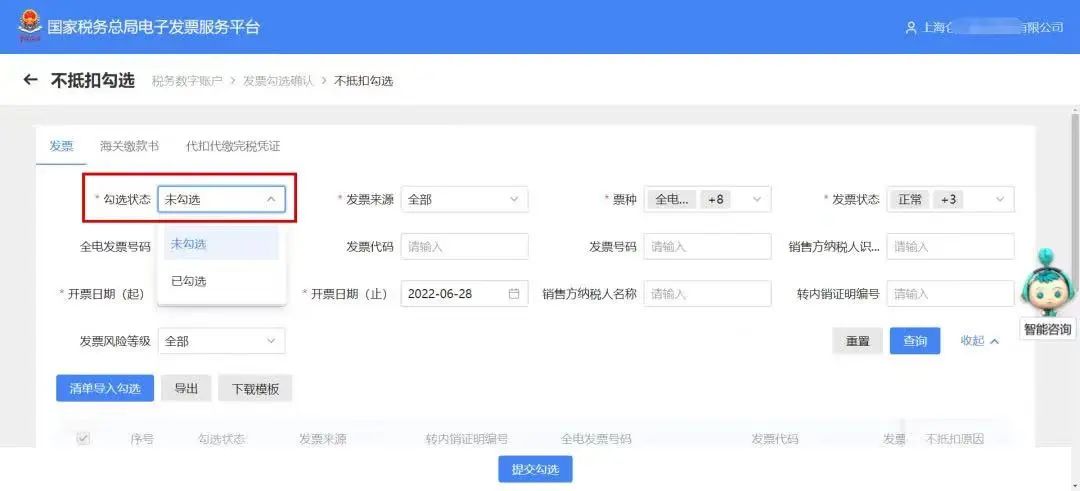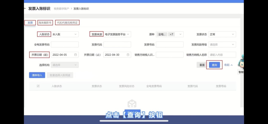 (7)将勾选状态设置为【未勾选】,选择【发票来源】和【发票状态】等必录项查询条件,点击【查询】;