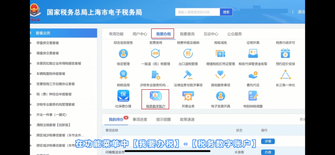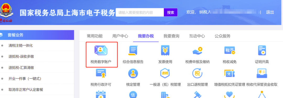 登录后进入税务数字账户相关路径:上海市电子税务局(体验新版)--【我要办税】--【税务数字账户】
