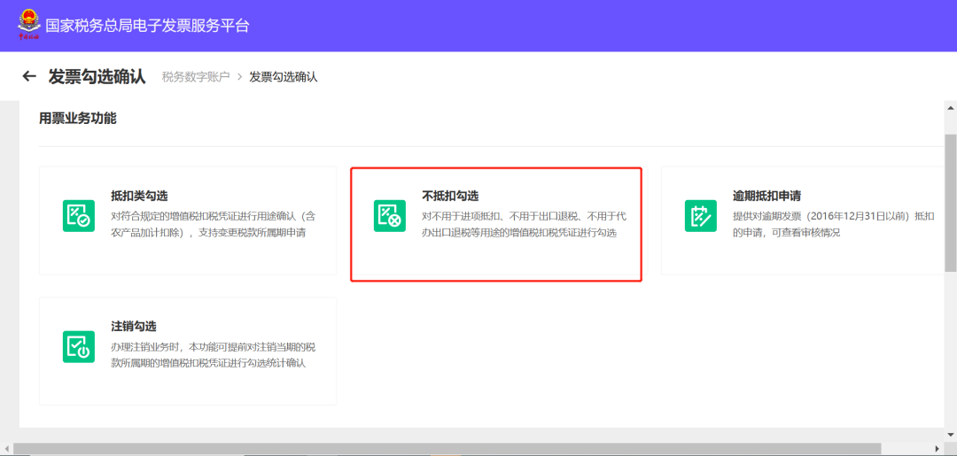 (1)【我要办税】--【税务数字账户】--【发票勾选确认】--【不抵扣勾选】;