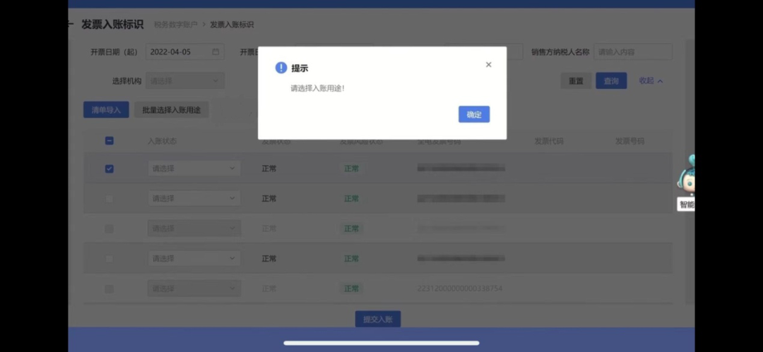 其中发票风险等级为【疑点发票】的发票显示为黄色,纳税人在勾选该类发票时系统将进行相应的提示,请谨慎操作。风险等级为【异常凭证】的发票显示黄色,且不允许操作;