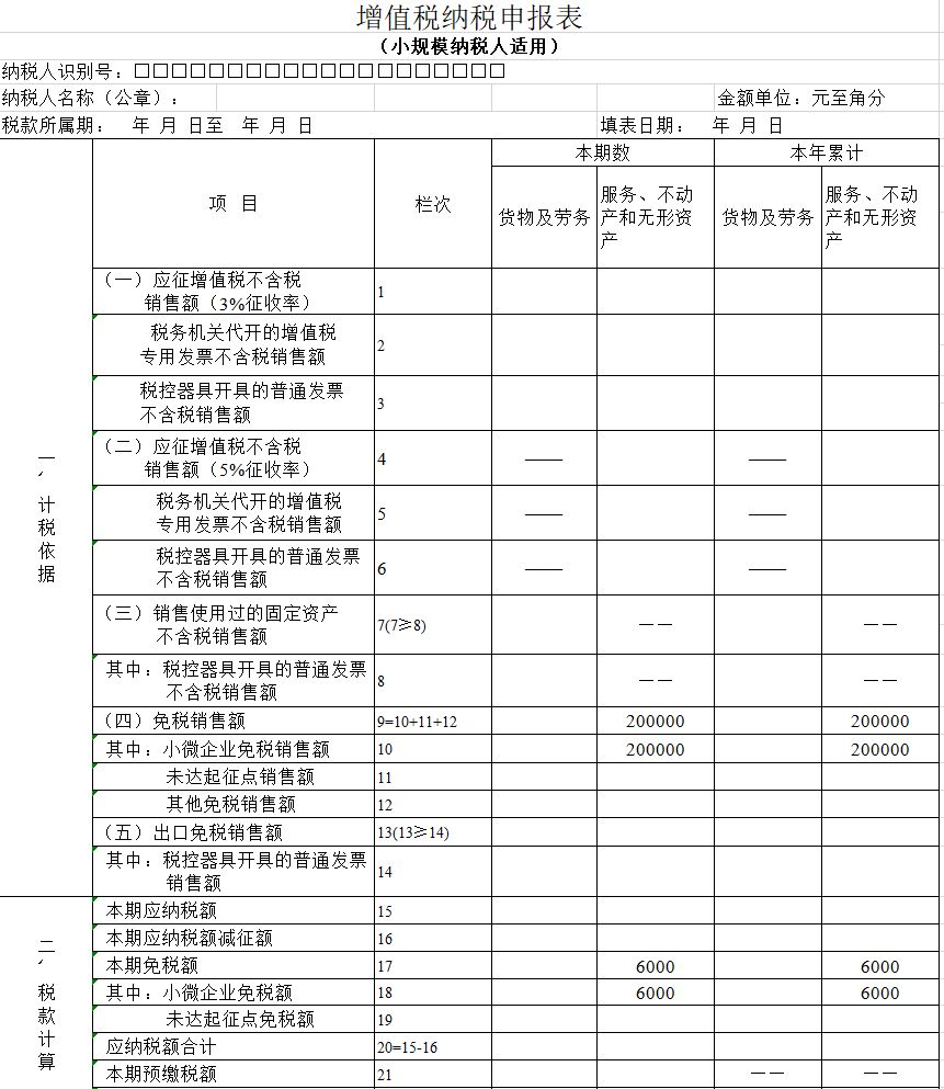 根据4号公告规定,《增值税纳税申报表(小规模纳税人适用)》中的“免税销售额”相关栏次,填写差额后的销售额,因此第9栏填写200000元。