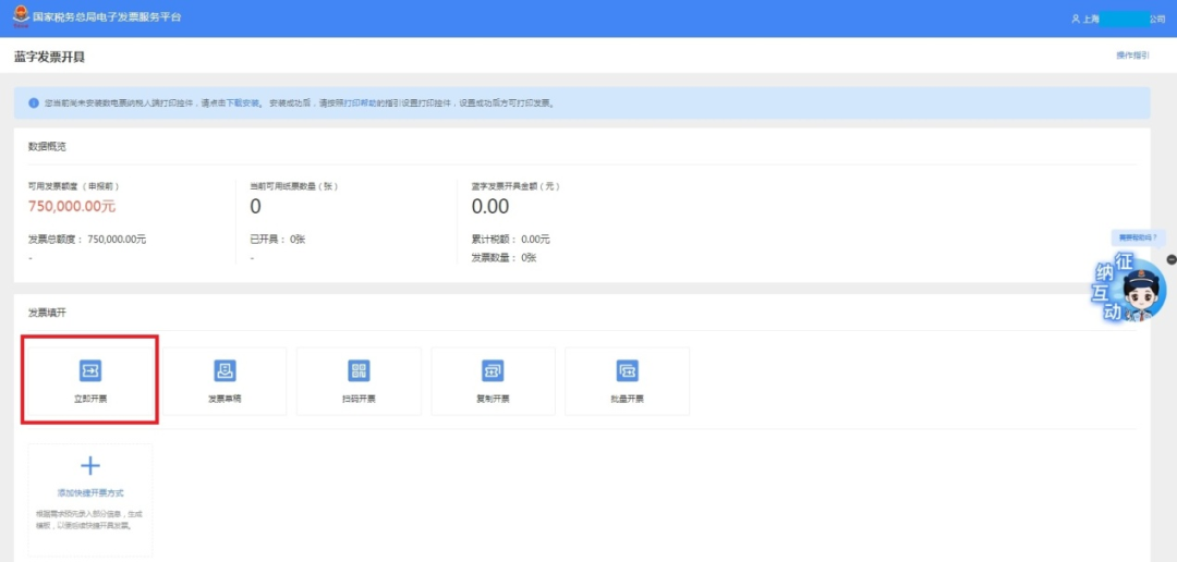 2.点击【立即开票】,选择【差额征税-差额开票】进入开票界面。