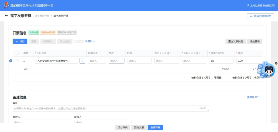 1.按照现行政策规定适用差额征税办法缴纳增值税,且不得全额开具增值税发票的,可在电子发票服务平台开具发票时选择“差额征税——差额开票”。如,经纪代理服务、旅游服务、劳务派遣服务(5)安保服务、人力资源外包服务、签证代理服务、金融商品转让等。
